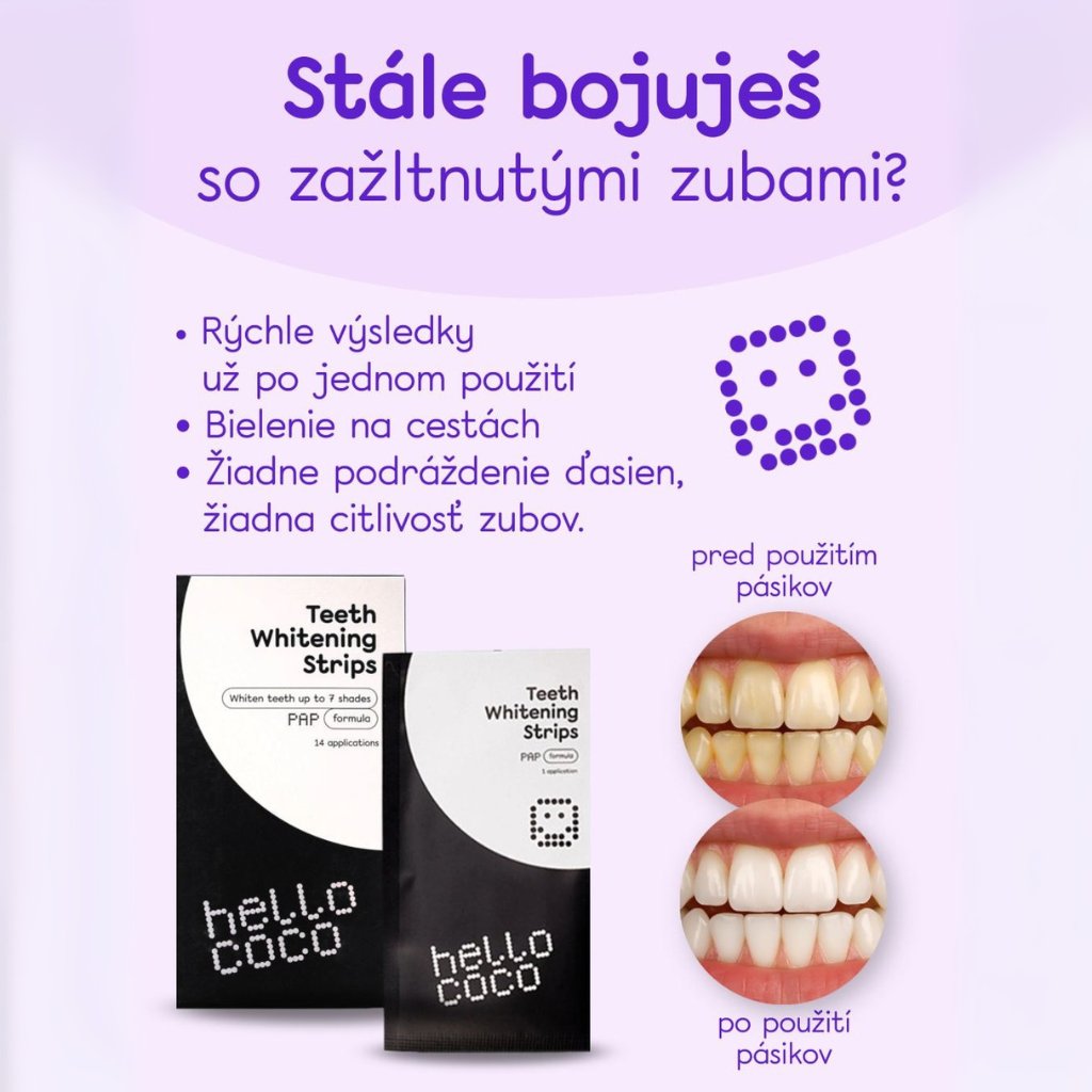 Tradičné bieliace pásiky používajú zloženie na báze peroxidu, ktoré môže vyvolať citlivosť zubov. hello coco PAP pásiky namiesto toho využívajú receptúru založenú na PAP bez citlivosti.