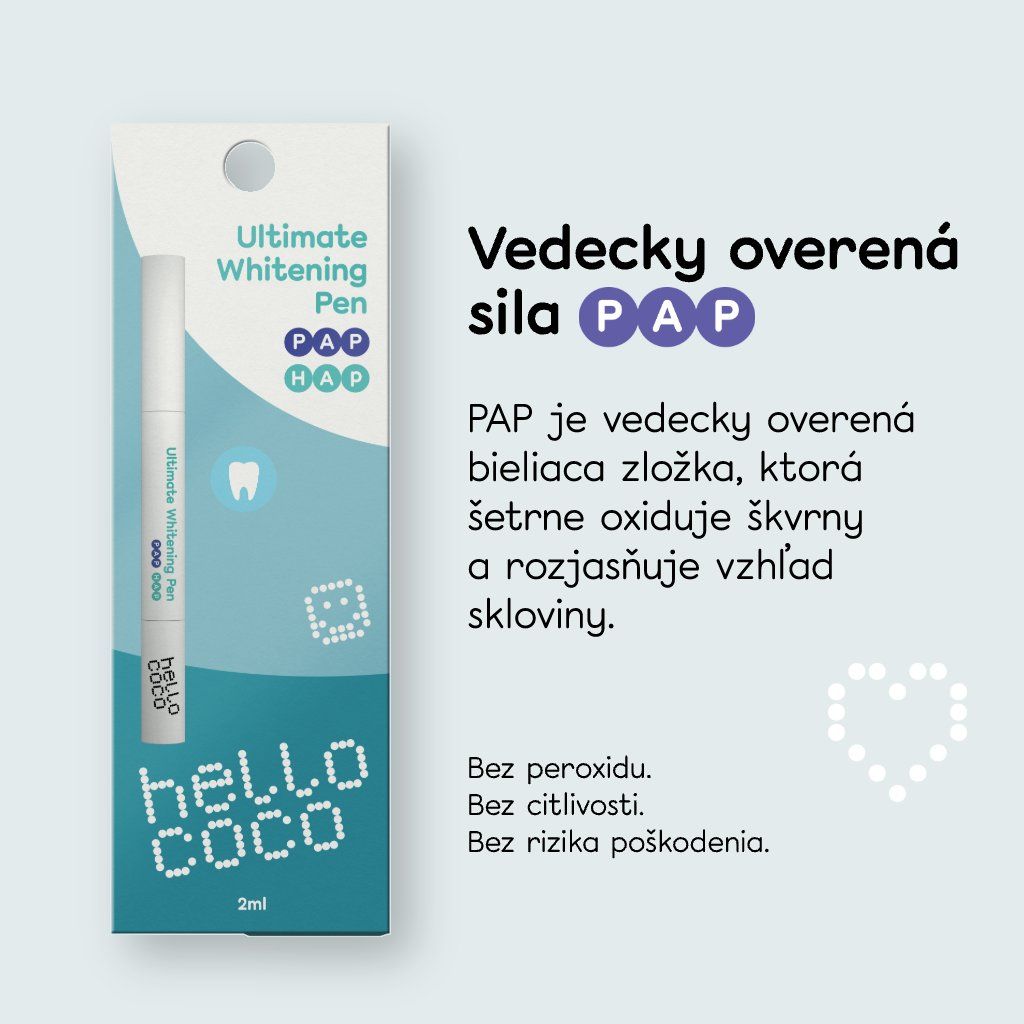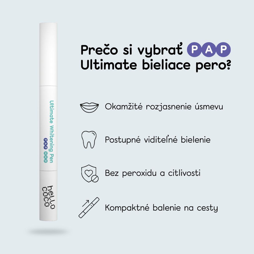 Bez námahy a efektívne PAP bieliace pero možno použiť ako postupné bielenie na dosiahnutie ešte belšieho úsmevu. PAP vedecky overená zložka na bielenie zubov, ktorá je bezpečnou alternatívou k peroxidu. Nemá žiadne negatívne vedľajšie účinky počas oxidácie zubných škvŕn čo umožňuje efektívne bielenie bez bolesti a citlivosti zubov.