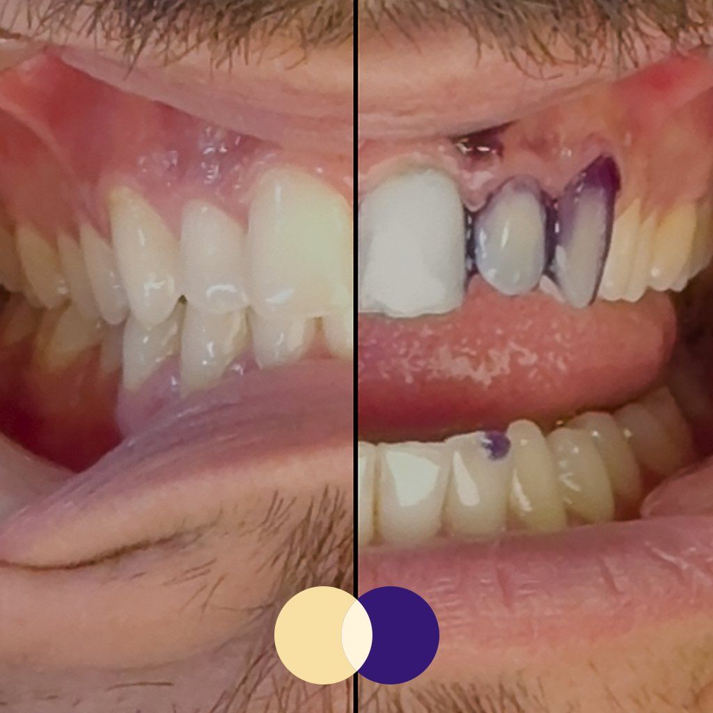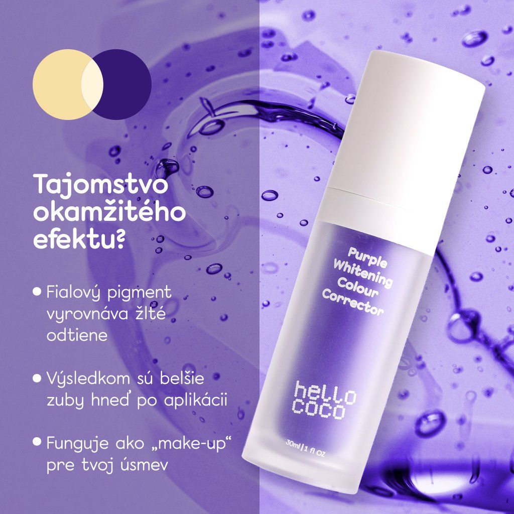 Farebná korekcia začína na farebnom koliesku, kde fialová a žltá sú doplnkové farby oproti sebe. Nanesením fialovej pasty na zuby zneutralizujete žlté podtóny a odstránite ich, čím sa odkryje výrazne jasnejší odtieň bielej.