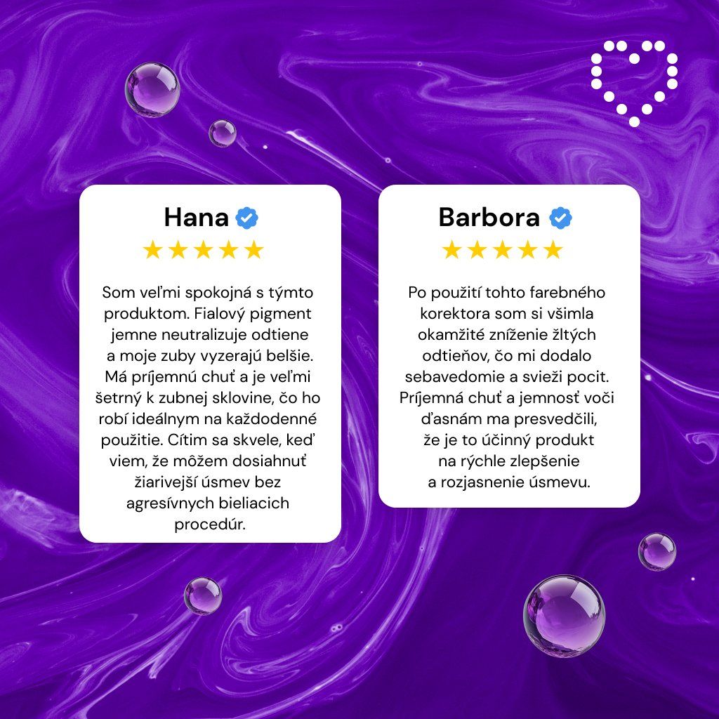 CCT (Color Correction Technology) pracuje na princípe farebnej korekcie používanom v kozmetike. Naša receptúra obsahuje presne vyladený fialový odtieň, mikropigmenty špeciálnej veľkosti a krémovú hustotu, ktoré sa pri kontakte so sklovinou rovnomerne rozložia a opticky vyrovnajú žlté odtiene. Výsledok? Okamžitý vizuálny efekt bez agresívnych chemikálií — ideálne pre citlivé zuby a každodenné použitie.