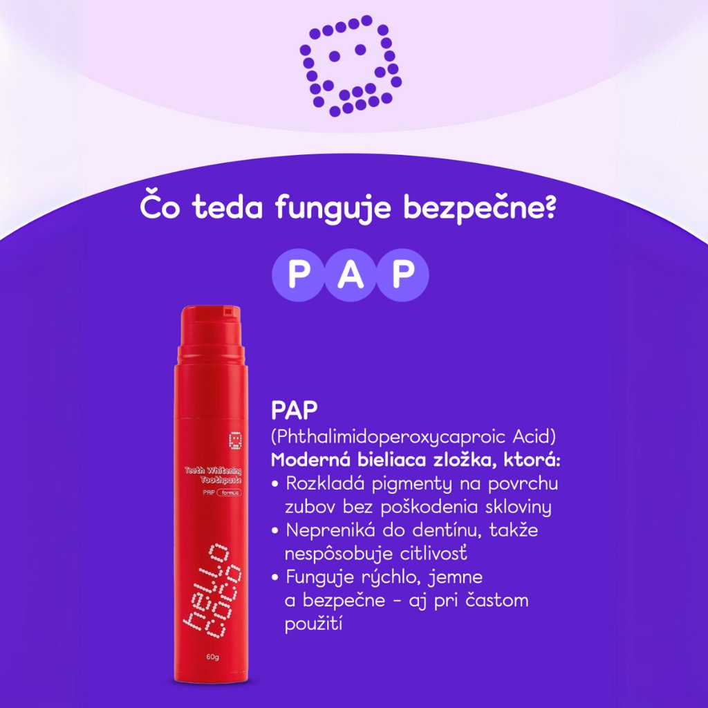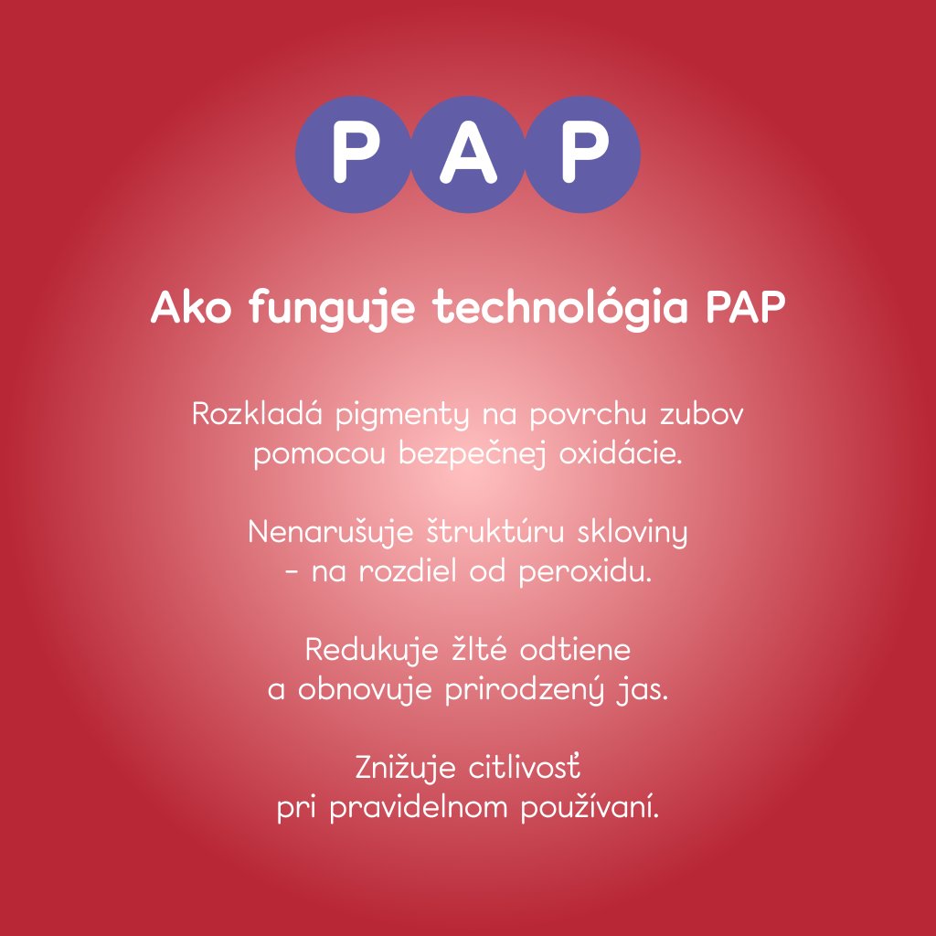 Phthalimidoperoxycaproicacid (PAP) vedecky overená zložka na bielenie zubov, ktorá je bezpečnou alternatívou k peroxidu. Nemá žiadne negatívne vedľajšie účinky počas oxidácie zubných škvŕn čo umožňuje efektívne bielenie bez bolesti a citlivosti zubov.